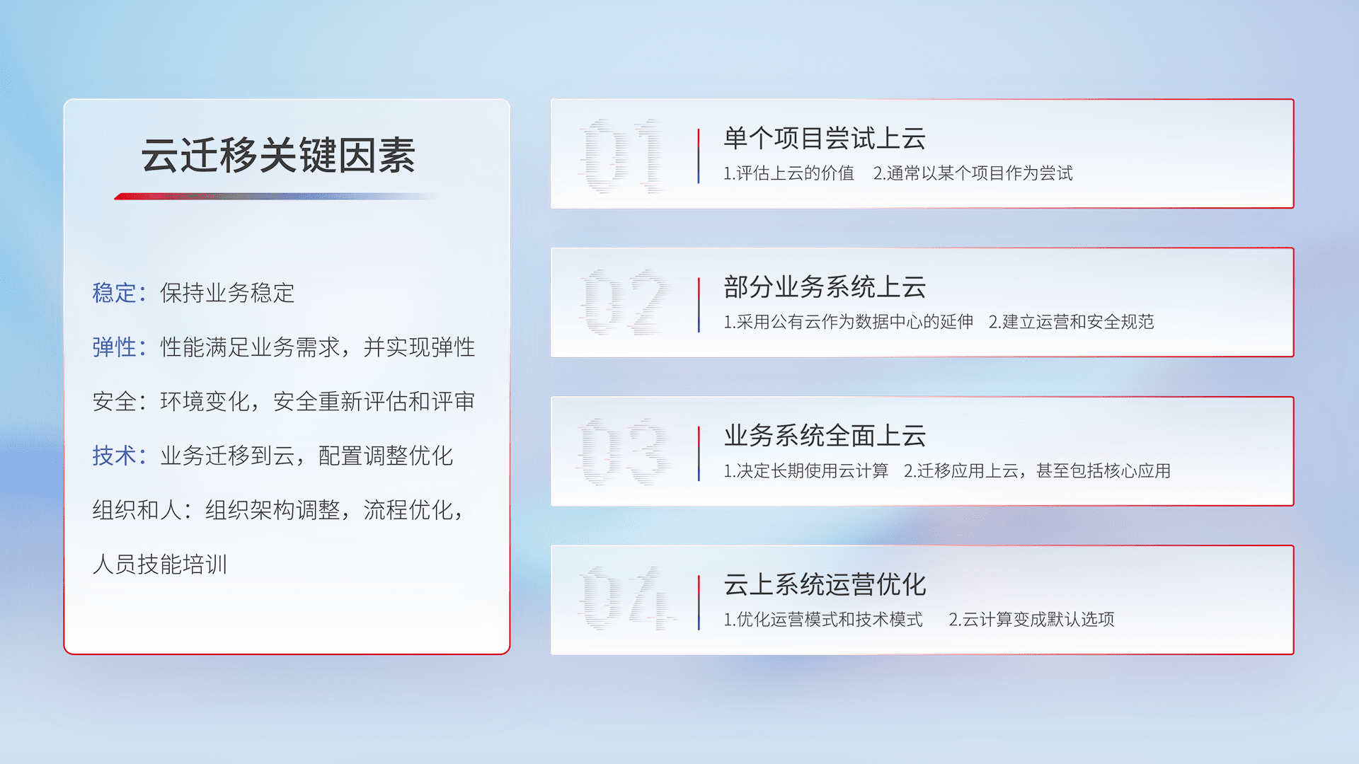 结合实际业务,,,,从规划设计、、、、云平台选型、、、、云原生改造、、数据迁移、、、集成交付,,迁移全过程为客户识别最佳上云路径,,,做好风险识别管理,,,设计网络架构、、、身份权限、、安全审计合规、、操作审计、、、、日志审计、、监控告警策略、、、、多站点容灾设计等,,,对云上基础设施进行整体规划,,,,提升IT治理水平,,,,以满足弹性、、高可用、、、高性能的需求。。。